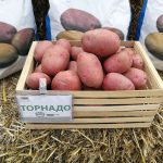 Сорт относиться к группе ранней спелости, созревание происходит на 50-60 день после высадки в грунт. Картофель Торнадо относится к высокоурожайным сортам, так как в кусте развиваются достаточно крупные клубни овальной формы ярко-малинового цвета, в количестве около 20 штук. Кусты небольшие, прямостоячие, неполегающие и быстро сохнут.